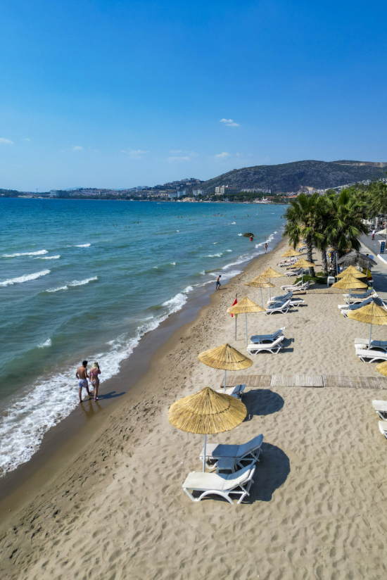 Risus Beach Resort Hotel, Ege’nin masmavi sularıyla altın sarısı kumlarını buluşturan Long Beach bölgesinde, denize sıfır konumda misafirlerini ağırlıyor. Deniz, kum ve güneşin en doğal hali burada.