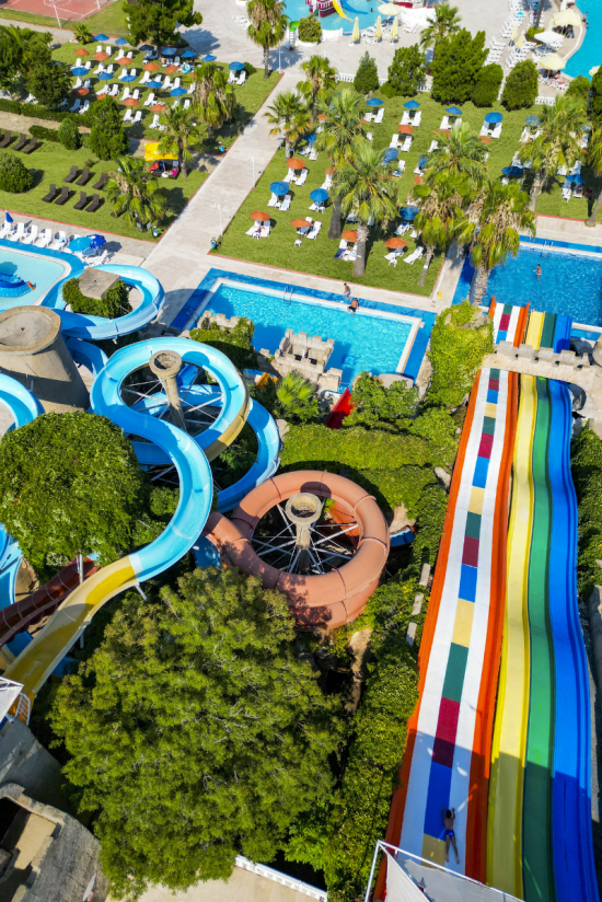 Tatili sadece deniz ve şezlongdan ibaret sananlar henüz burayı görmedi. Otel misafirlerimize ücretsiz sunulan aquapark alanında 7 kaydırak, 4 yüzme havuzu ve 2 çocuk havuzu ile gün boyu adrenalin ve eğlence bir arada.